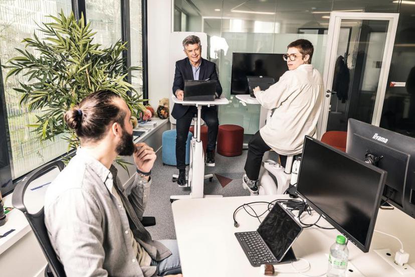Grâce à sa tablette intégrée, l’utilisateur a le choix entre un bureau classique, un bureau sur lequel il peut pédaler et un bureau debout. Trois types de positions pour associer le travail et la santé !